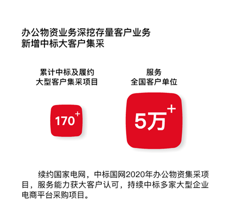 今年,齐心B2B办公物资业务新增中标多个大客户集采项目,并持续深挖存量客户业务,大客户增长保持稳健上升的势头:续约国家电网,成功中标国网2020年办公物资集采项目办公设备类、办公耗材类、办公用品类、办公电器类、办公日用类5个标包,服务能力获大客户认可;中标中国海油2020-2022年度办公生活用品及耗材采购项目,成为入围的仅三家供应商之一,中标金额1亿元人民币;中标南方航空阳光商城通用类物资采购项目,提供办公电器设备、计算机耗材、办公文具、音像设备、厨房消耗品、低值易耗品、其他通用类物资共计七大品类商品。