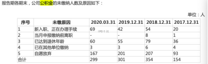 具体来看,截至2020年3月末,公司缴纳住房公积金的员工仅有299人,缴纳工伤、失业、生育保险的员工仅有366人,缴纳医疗保险和养老保险的分别有317人、341人。而在299个未缴纳公积金的员工中,有167人是自愿放弃。