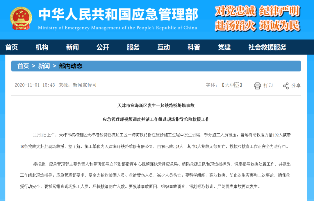 据滨海发布11月1日消息,当天上午9时许,天津南环铁路维修有限公司在南环铁路进行桥梁维修过程中发生坍塌事故。截至目前已救出5人,其中2人抢救无效死亡。