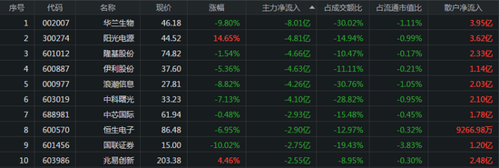 从个股来看,华兰生物、阳光电源、隆基股份分别遭主力资金卖出8.01亿元、4.81亿元、4.66亿元。