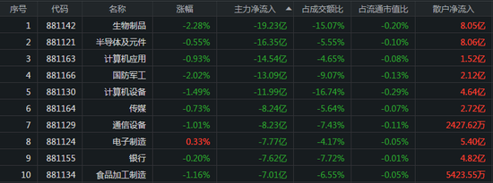 主力资金流出的板块分别是生物制品、半导体及元件、计算机应用,主力资金流出金额分别为19.23元、16.35亿元、14.54亿元,其中散户净流入金额为8.05亿元、8.06亿元、1.52亿元。