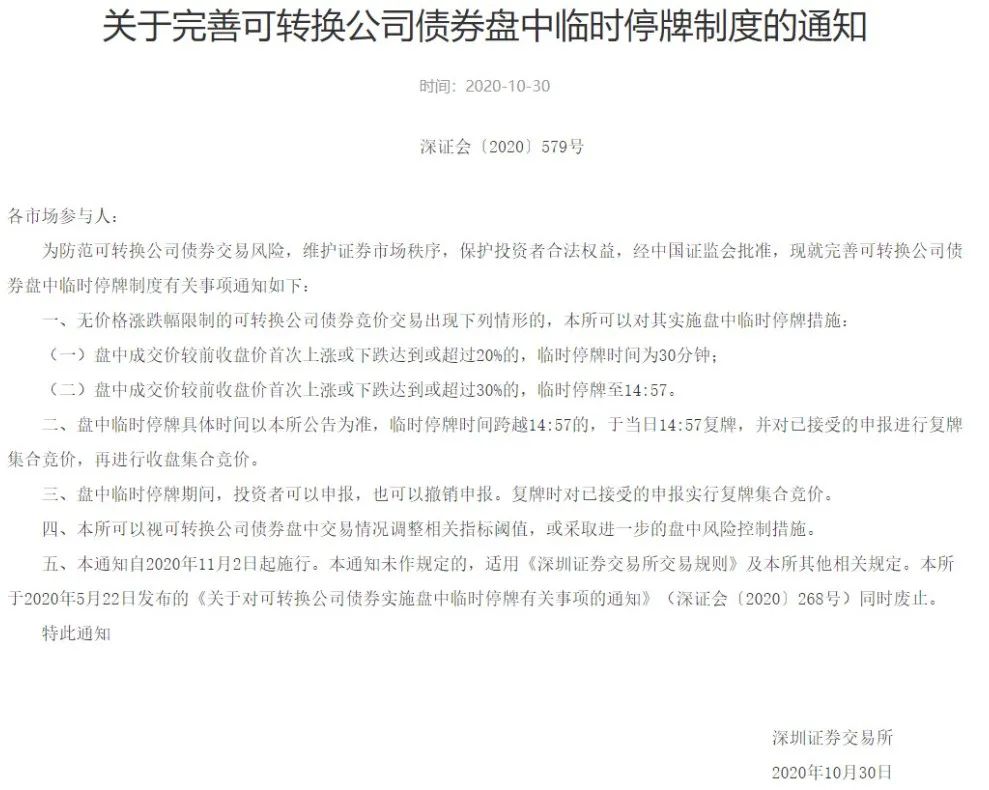 10月30日,深交所发布《关于完善可转换公司债券盘中临时停牌制度的通知》,规定“盘中成交价较前收盘价首次上涨或下跌达到或超过30%的,临时停牌至14:57”, “临时停牌时间跨越14:57的,于当日14:57复牌,并对已接受的申报进行复牌集合竞价,再进行收盘集合竞价”。