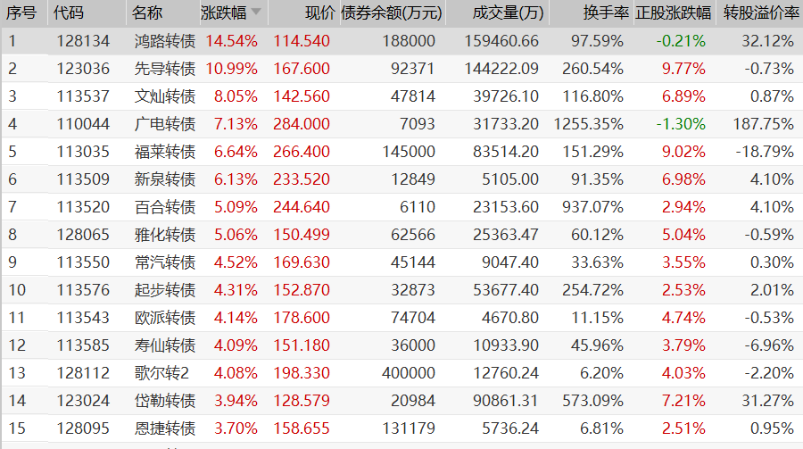 截至上午收盘,仅首日上市的鸿路转债触发过“熔断”,且复盘后涨幅回落。上涨个券方面,仅有鸿路转债、先导转债两只转债涨幅超过10%。