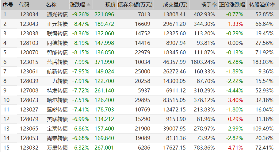 此前曾被“爆炒”的通光转债、正元转债、智能转债、蓝盾转债跌幅居前。截至上午收盘,超6成转债下跌,中证转债指数跌0.09%。