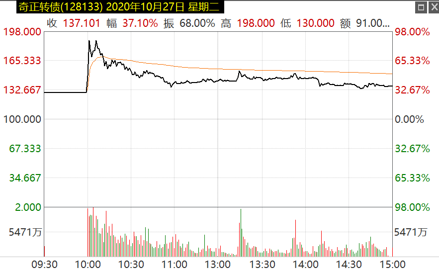 例如,奇正转债于10月27日在深交所上市,盘初涨30%被停牌半小时,复牌后即大幅拉升,一度涨近100%。