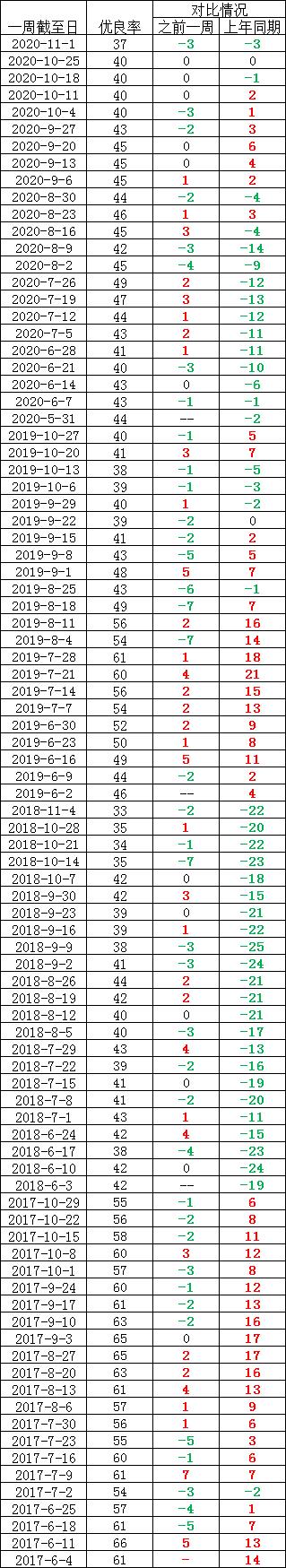 以下为2017年以来USDA周度棉花优良率统计(单位:百分比):