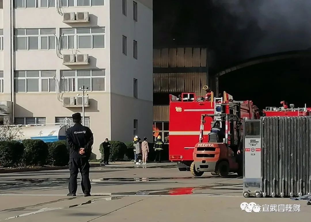 网友在现场看到,该着火点位于办公楼后,是一个长度超过100米,高约4层楼的厂房。现场黑烟滚滚,因为厂房过高,火势较大,消防车只能在外围喷水灭火,火势一时难以控制。