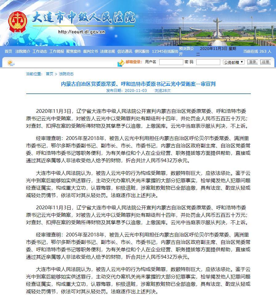 2020年11月3日,辽宁省大连市中级人民法院公开宣判内蒙古自治区党委原常委、呼和浩特市委原书记云光中受贿案,对被告人云光中以受贿罪判处有期徒刑十四年,并处罚金人民币五百五十万元;对查封、扣押在案的受贿所得财物及其孳息予以追缴,上缴国库。云光中当庭表示服从判决,不上诉。
