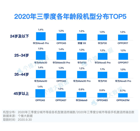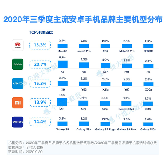 从各品牌的主要机型分布来看,OPPO手机用户使用的机型较为集中,机型Top5占比总和达20.7%。