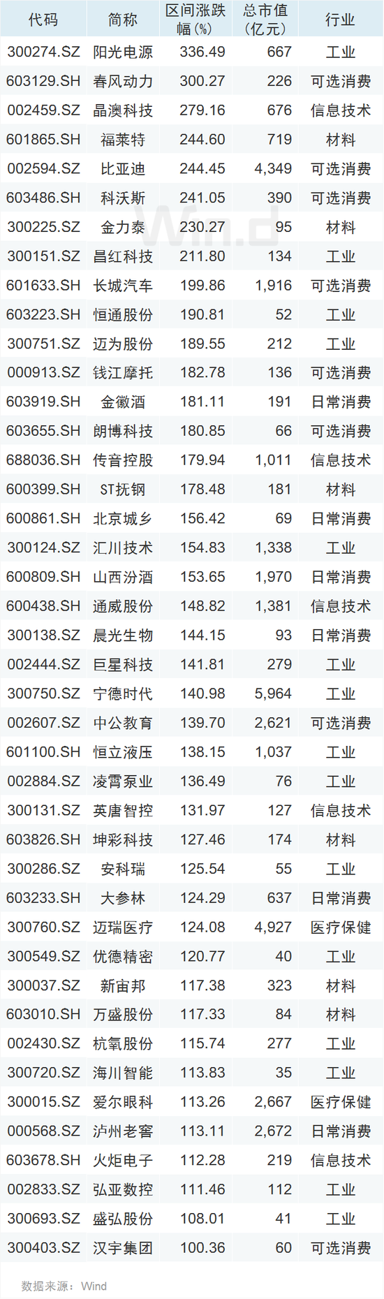 从创新高公司股价表现来看,有42家公司今年以来股价涨幅超过100%,其中阳光电源今年以来涨幅超过300%,此外,春风动力、晶澳科技、福莱特、比亚迪、科沃斯、金力泰、昌红科技年内涨幅亦超过200%(剔除今年以来上市新股)。