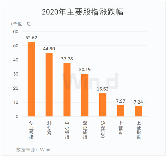 从今年以来A股表现来看,主要股指均大幅上涨,其中创业板指涨幅超过50%,科创50、中小板指、深证成指涨幅均超过30%,而上证50和上证指数涨幅低于10%。可见,指数之间表现差异巨大。