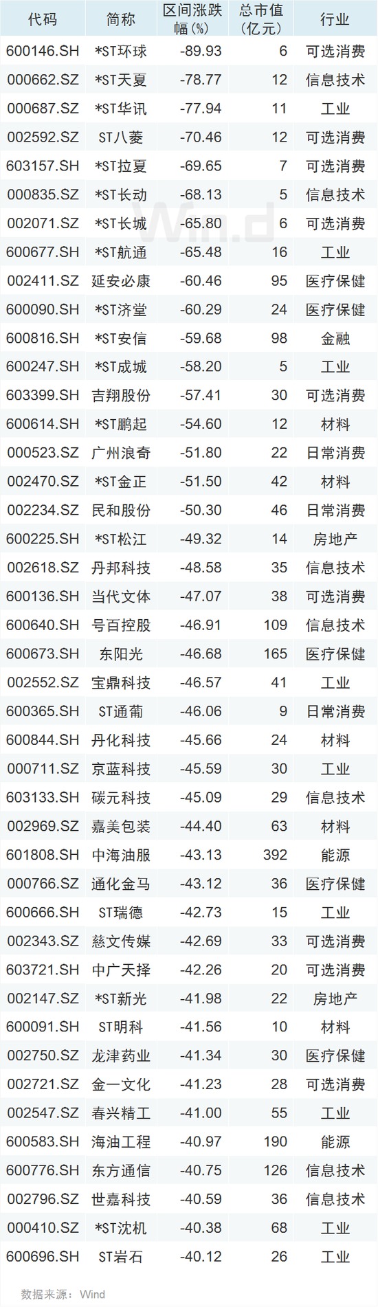 从创新低公司股价表现来看,有43家公司今年以来股价跌幅超过40%,跌幅靠前的多为ST类公司,其中*ST环球今年以来跌幅超过80%,公司前三季度亏损金额达0.93亿元,若今年继续亏损,则存在退市风险。