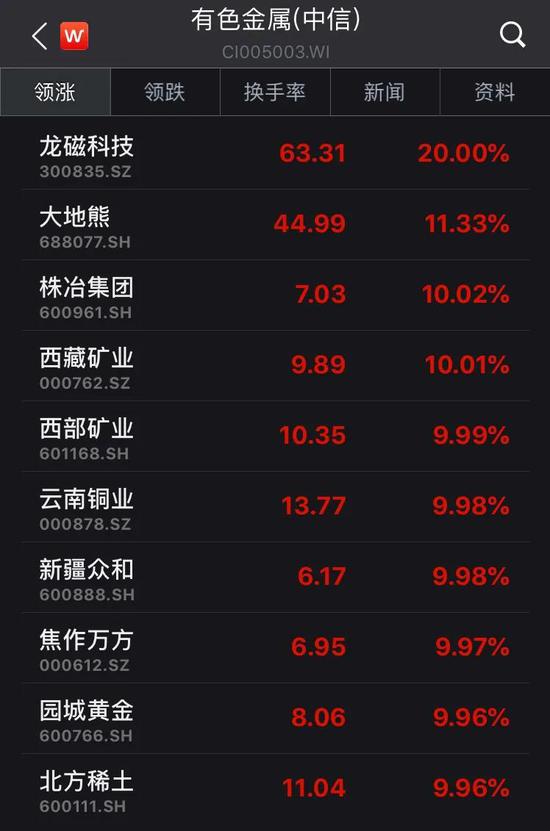除了券商股外,稀土、锂矿、小金属等集体活跃。龙磁科技、银河磁体、格林美、株冶集团、西藏矿业、盛屯矿业、北方稀土等股涨停。