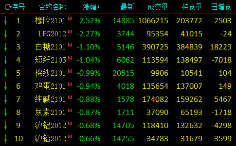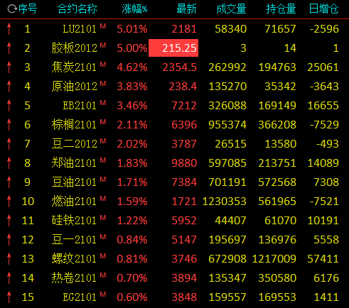 热点栏目11月4日,国内期市早盘多数品种上涨,能化品大涨,低硫燃油涨逾5%,原油涨近4%,苯乙烯涨逾3%,但橡胶、LPG跌逾2%;油脂走升,棕榈油涨逾2%,豆油、菜油涨近2%;黑色系飘红,焦炭大涨逾4.5%;跌幅方面,白糖、短纤跌逾1%。