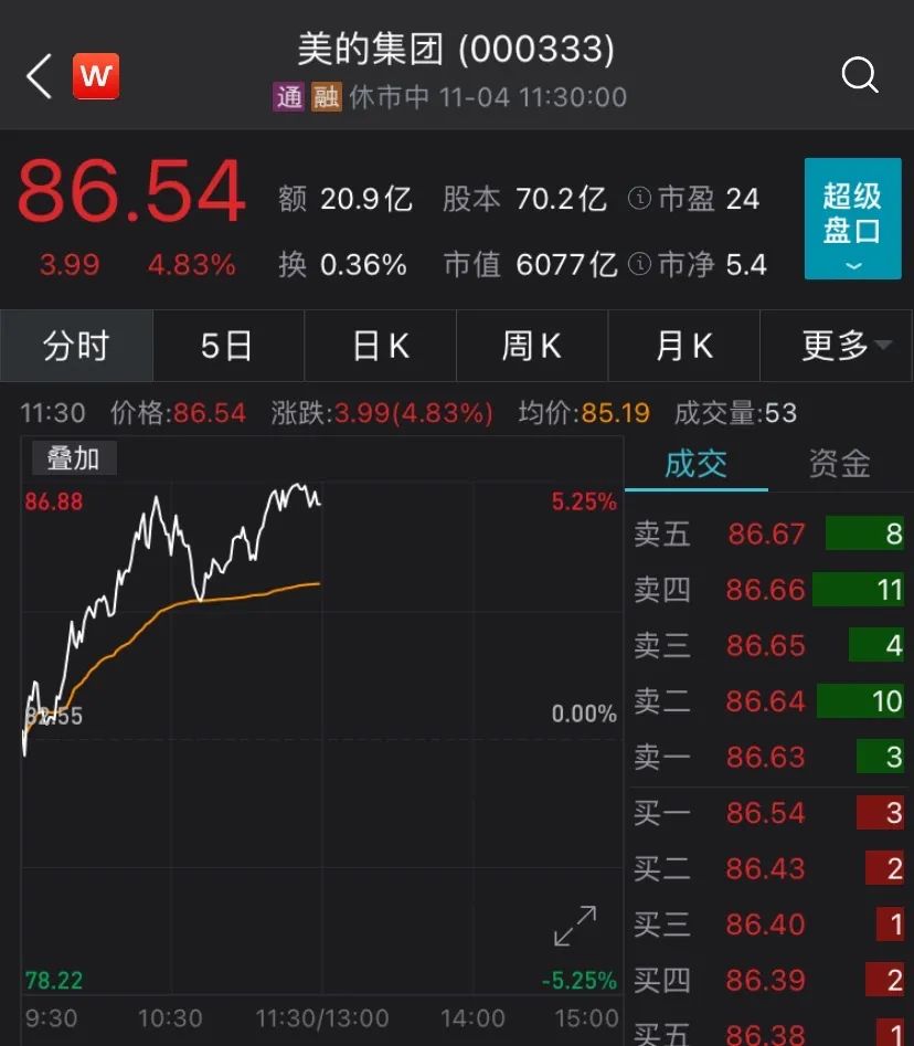 值得一提的是,美的集团早盘一度涨逾5%,最高上探至86.88元,创历史新高,总市值突破6000亿元;午间收盘时涨幅为4.83%,报86.54元,总市值为6077亿元。11月不足3个交易日内,美的集团股价已累计涨逾11%。