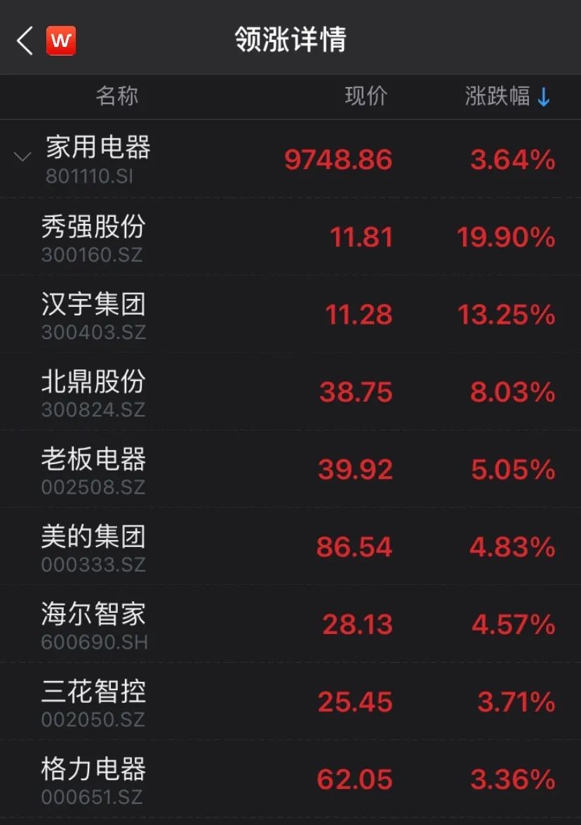 家用电器板块半日涨3.64%。板块内,秀强股份(维权)盘中一度涨停,北鼎股份、汉宇集团、老板电器纷纷跟涨。