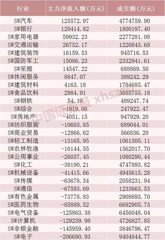 从行业板块情况来看,汽车、银行、家用电器行业主力资金净流入金额居前,净流入金额分别为12.56亿元、12.04亿元、5.99亿元;电子、非银金融、计算机行业主力资金净流出金额居前,分别净流出20.67亿元、14.60亿元、12.92亿元。