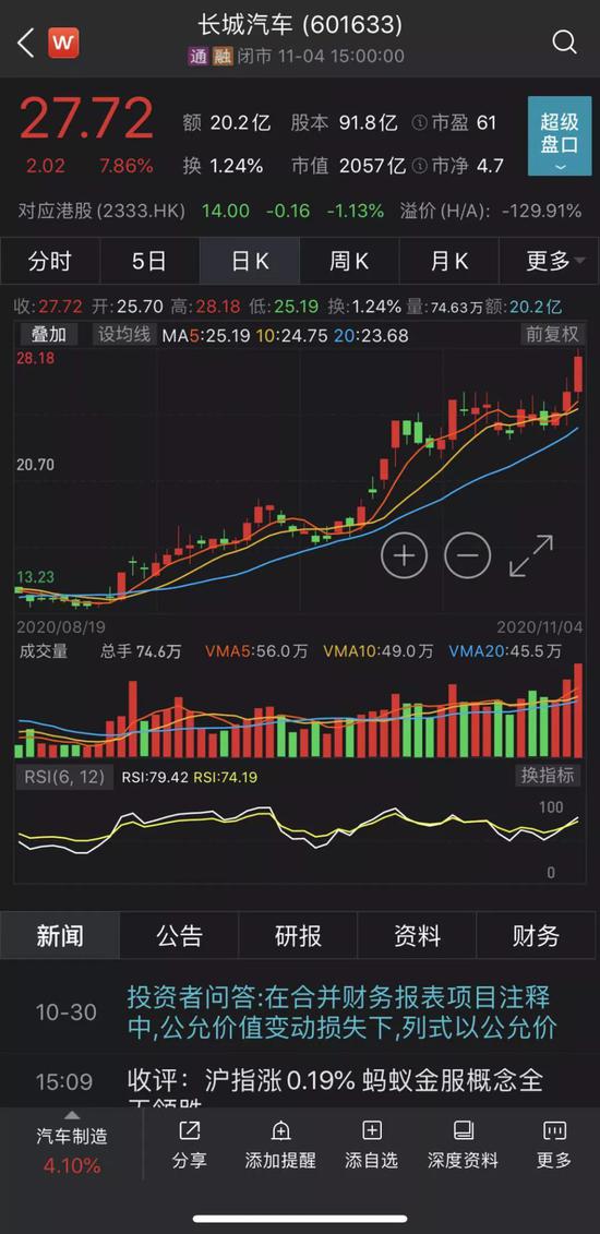 值得注意的是,今日位居行业涨幅榜第二位的汽车行业内有多只股票创下历史新高,如福耀玻璃、华域汽车、长城汽车等。以长城汽车为例,今年以来,长城汽车累计上涨223.45%,本周3个交易日,长城汽车累计上涨16.86%,市场表现远超大盘。截至11月4日收盘,长城汽车总市值达2543.57亿元。