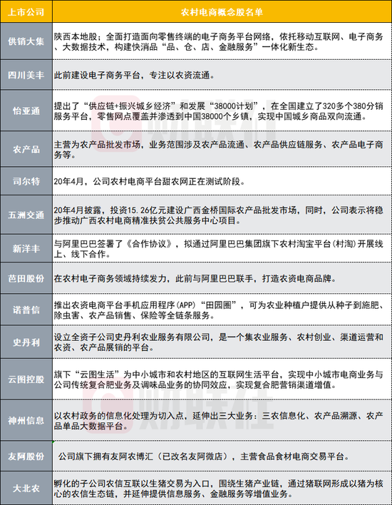 财联社联合星矿数据梳理农村电商概念股如下: