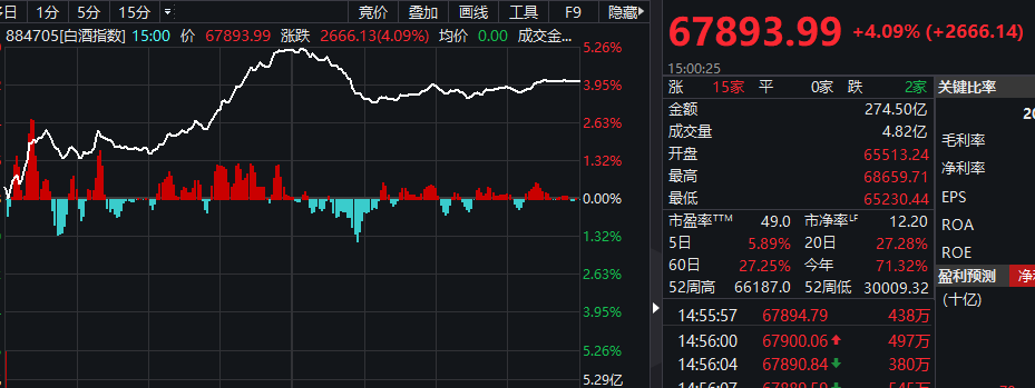 白酒板块依旧是资金热炒目标,白酒指数涨4.09%。酒鬼酒、老白干酒封住涨停板,伊力特、迎驾贡酒接近涨停。五粮液涨2.68%,市值首次突破1万亿元;贵州茅台涨1.76%。