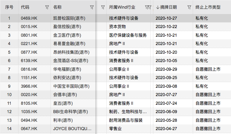 今年由于外部环境变化剧烈,退市企业据wind数据显示,截至11月5日,年初至今在香港市场中以私有化及自愿撤回上市地位方式,成功退市的企业多达18家,较去年同期增长超6成。其中包括凯普松国际、盈信控股、金卫医疗等,从行业来看范围较为广阔,其中房地产、技术硬件与设备、公共事业均有2家企业退市。