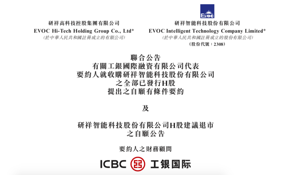 对于研祥智能私有化一事要追溯至今年6月23日。此前,研祥智能发布公告表示,工银国际融资代要约人确认拟作出自愿有条件现金收购要约,以收购全部已发行H股。每股H股要约为现金1.50港元,较公司6月15日H股收市价0.91港元溢价约64.8%。