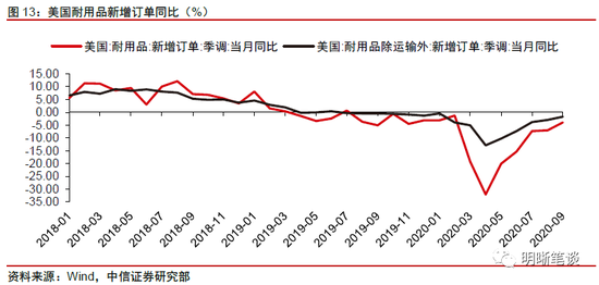 投资方面,美国耐用品新增订单环比连续六个月增长,耐用品新增订单当月同比降幅继续收窄。美国9月耐用品新增订单规模录得2374亿美元,为疫情爆发以来最高值,但尚未恢复到疫情前水平,9月耐用品新增订单当月同比降3.92%,前值降7.10%,除运输外9月美国耐用品订单当月同比下降1.68%,前值将3.05%。美国耐用品新增订单同比降幅有所收窄,反映美国投资状况逐渐回暖。
