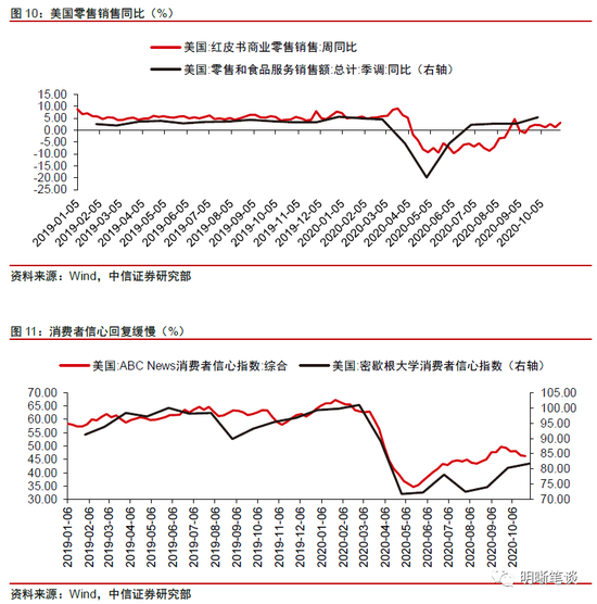 消费方面,在基本面经历过二季度的强烈冲击、出行限制逐渐解除之后,美国消费需求有所释放,消费逐步回暖,但消费者信心指数显示消费者支出意愿难言强烈。一方面,随着美国推进经济重启、防疫政策放松,前期被抑制的消费需求出现集中释放,美国红皮书商业零售销售周同比和美国零售和食品服务销售额月同比显示出美国消费的反弹迹象:从同比增速上看,红皮书商业零售销售周同比已恢复至接近疫情前水平,9月美国零售和食品服务销售额月同比录得5.36%,已高于2020年疫情爆发前的水平。但从消费者信心的情况来看,美国居民对于消费的预期仍旧较为谨慎:根据密歇根大学公布的月频数据和ABC News统计的周频数据,当前美国消费者信心指数虽处于缓慢回升的过程中,但远低于疫情前水平。结合美国零售销售同比和消费者信心指数走势,虽然在经济重启后美国零售数据出现了快速的反弹,但消费者信心指数回复明显较为缓慢,消费者对于未来的预期仍旧倾向谨慎,支出意愿难言强烈。