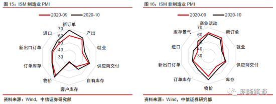 经济景气方面,美国10月制造业PMI指数大幅超出市场预期,录得2018年11月以来新高,反映制造业活动的明显改善,但非制造业PMI指数略不及预期和前值,反映出美国疫情反复对于非制造业的影响。美国10月ISM制造业PMI为59.3,前值55.4,制造月PMI表现超出市场预期升至2018年11月以来的最高水平;非制造业PMI为56.6,前值57.8,预期57.5。PMI指数反映出当前美国经济处于复苏阶段,制造业活动改善明显。具体而言,制造业方面,PMI新订单指数为67.9,前值60.2,新订单激增有力拉动了制造业PMI上扬,PMI就业指数录得53.2,自2019年7月以来首次回到荣枯线上方,符合美国就业市场改善的整体趋势。但非制造业方面,10月美国非制造业PMI报56.6,相较前值57.8小幅下行,近期美国疫情的反复或对非制造业产生一定的影响,放缓了非制造业的改善进程。