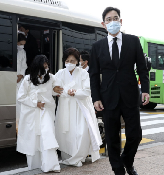 遗体告别式上,李健熙的大女儿李富真因悲伤过度无法站立。慌乱中,是75岁的老母亲洪罗喜一脸镇定地搀扶起女儿,掌控了全场。
