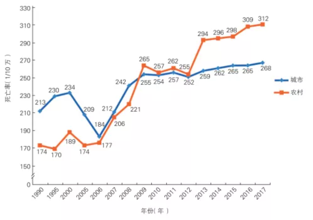 1990—2017年中国城乡居民心血管病死亡率变化(图源:央视新闻)