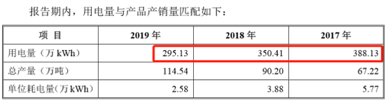 招股书解释:公司用电量与产量变动趋势不一致,主要原因系公司耗电量较高的主要系精矿生产过程,综合利用产品与原矿耗电量较低,2017年、2018年、2019年,精矿产量分别为3.86万吨、3.17万吨、2.23万吨,持续大幅下降,导致精矿车间用电量持续大幅下降。