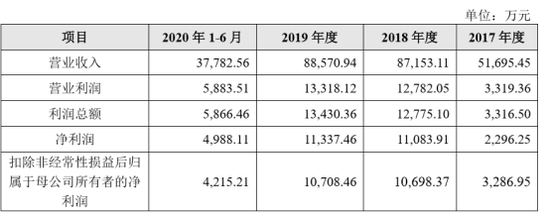 2017年、2018年、2019年及2020年上半年,公司营业收入分别为5.17亿元、8.72亿元、8.86亿元及3.78亿元,扣非归母净利润分别为0.33亿元、1.07亿元、1.07亿元及0.42亿元。