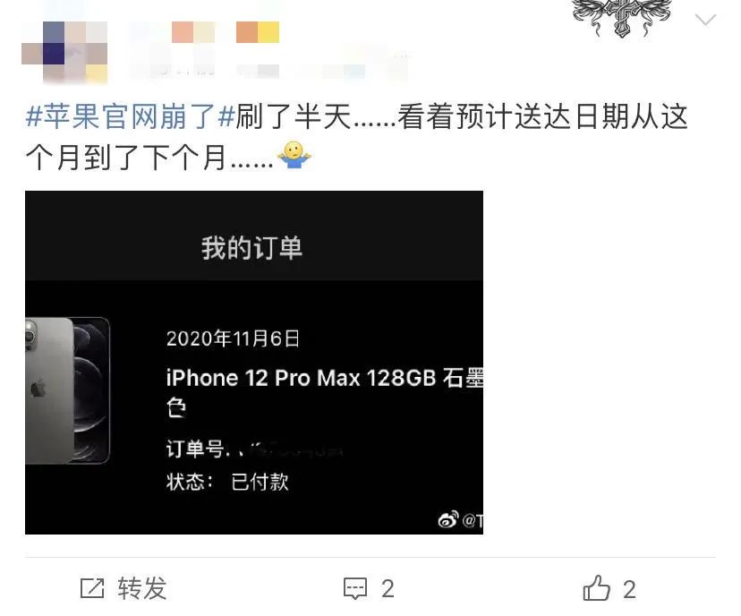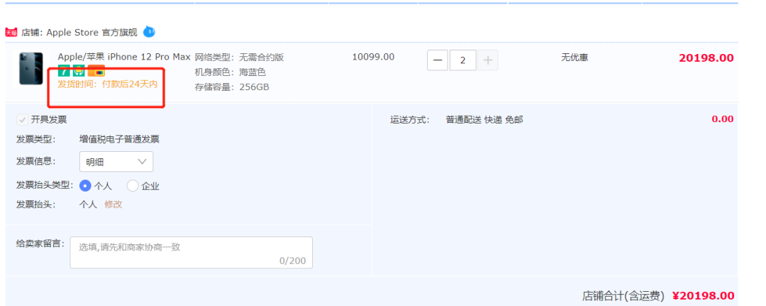 苹果天猫旗舰店及苹果官网对新机均进行了限购,每款机型人均限购两部。目前,iPhone 12 Pro MAX仍可下单,但发货时间为付款后24天内。