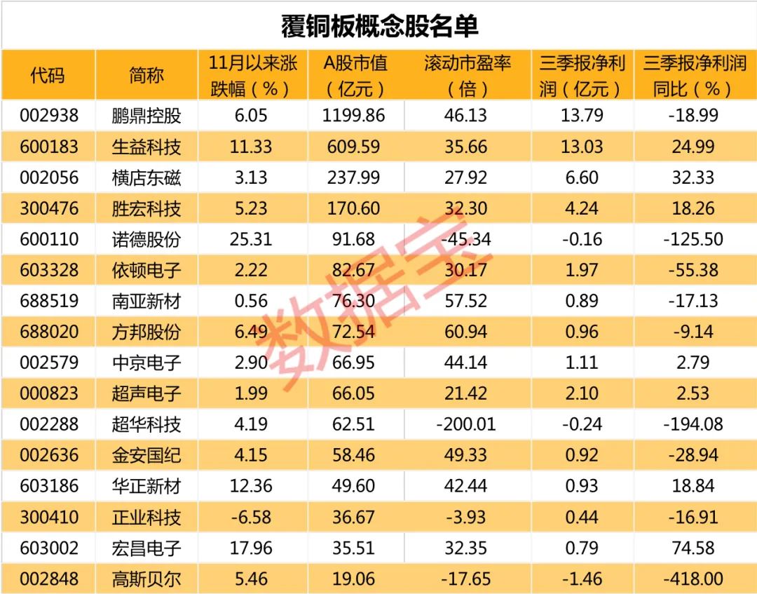 覆铜板概念股近期股价表现较好。根据证券时报·统计显示,覆铜板概念股有16只。11月以来的第一周,有9只覆铜板概念股收获3天及以上的股价上涨天数,其中诺德股份自10月的最后一个交易日以来,已经实现连续6个交易日上涨,股价涨幅28.96%,再创年内新高。公司是中国大陆第一家电解铜箔的生产商,是国内知名的新能源锂电池材料龙头供应商。目前公司整体铜箔产能为年产4.3万吨,全部具备6微米铜箔生产的能力。此外,宏昌电子、华正新材和生益科技本周5个交易日的股价涨幅均超过10%。