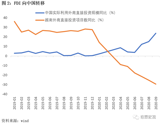 而且据我们了解,有很多跨国企业甚至将产业链向中国转移了。因为跨国企业发现不能仅依赖比较优势理论获得最大化利润,还要考虑产业链的稳定性。比如来了疫情,某国停产,交不了货,搞不好终端产出就出不来了,所以现在一些跨国企业反而把产业链转向中国。我们看到今年中越两国的FDI增速之间有很明显的背离,中国的FDI同比增速是往上走的,过来的产业链一时半会不会走。