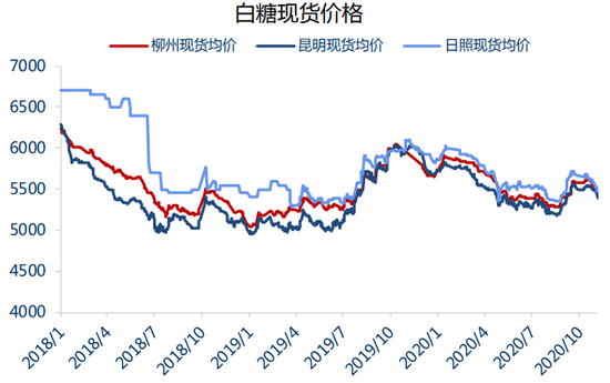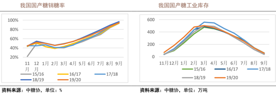 9 月末内蒙古和新疆地区 20/21 榨季拉开序幕,历经约一个月的过渡期之后,甜菜的收割以及糖产量已达到非常稳定的水平,加上近期北方地区少雨,利于甜菜收割。甜菜周度供应量基本接近 10 万吨/周的供应水平,且价格方面占据一定优势,因此快速抢占了华北以及华中地区部分市场份额。甜菜糖将进入开榨高峰,每月糖产量将达到 40 万吨左右,加工糖产量也能达到这一量级,而 11 月销量预计仅在 40 万吨以下。整体消费层面支撑不强。