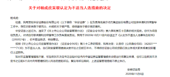 作为安徽省唯二的券商,华安证券近期遇到了烦心事:因为担任一家新三板挂牌公司主办券商时失职,监管要求其定期“写检查”;更有一名离职多年的责任人员,也被投资银行领域“封杀”五年。