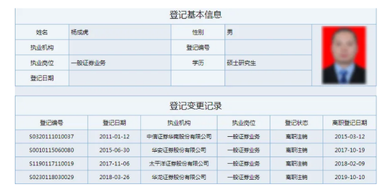 可相印证的是协会和伟海精英数据,当事人的任职颇为复杂:2011年1月至2015年6月,任职于广州证券融资部;2015年6月至2017年11月,任职于华安证券投资银行总部;2017年11月至2018年3月,任职于太平洋证券投资银行综合部;2018年3月起任职于华龙证券,2019年10月离职。