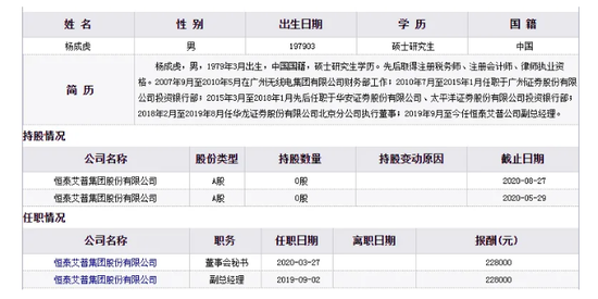 颇为离奇的是,自2019年3月起,杨成虎的名字,出现在上市公司恒泰艾普(300157.SZ)的高管序列中。
