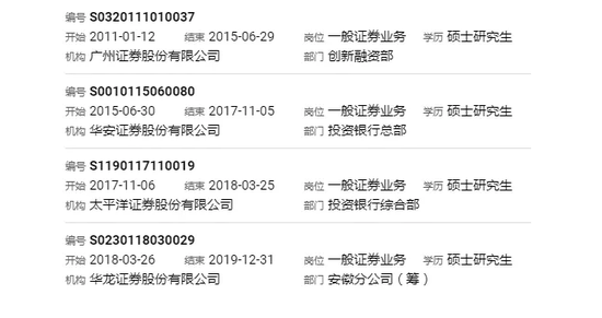 在上述四家券商任职期间,其执业资格均为“一般证券业务”。