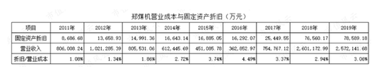 2011-2016年,固定资产折旧主要是与生产煤机设备相关,折旧金额最高的是2015年,达1.69亿元,在煤机业务收入保持增长在2011-2012年,折旧与营业收入比值低于1.4%;而2014-2016年,煤机业务收入下降,该比值达4.5%,但金额最高没超过1.7亿元。