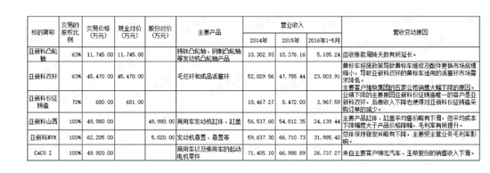 2016年3月25日,公司发布并购预案,以22亿元(现金对价16.5亿元和股份对价5.5亿元)收购亚新科(中国)投资有限公司(以下简称“亚新科”)旗下部分资产的预案,具体收购标的包括:亚新科凸轮轴63%股权、亚新科双环63%股权、亚新科仪征铸造η0%股权、亚新科山西100%股权亚新科NVH100%股权、CACGLTD.I00%股权等6家公司全部或部分股权。