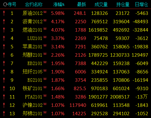 热点栏目11月10日,国内期市收盘涨跌不一,能化品多数上涨,原油涨近6%,沥青、燃油涨逾4%,甲醇涨逾2%,橡胶跌逾3%,PVC、LPG跌逾2%;贵金属大跌,沪银跌逾6%,沪金跌逾3%;农产品飘绿,菜粕、鸡蛋、豆粕跌逾2%,苹果涨逾3%。