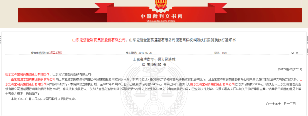 2018年9月,中国裁判文书网发布的“山东宏济堂制药集团股份有限公司、山东宏济堂医药连锁有限公司侵害商标权纠纷执行实施类执行通知书”显示,因山东宏济堂医药连锁有限公司未主动履行生效法律文书确定的义务,山东宏济堂制药集团股份有限公司向法院申请执行。法院依法立案执行后,至2017年11月29日止,已强制执行到位51405元。