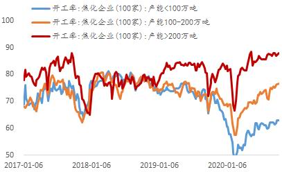 今年受焦化去产能以及环保政策等因素影响,不同类型焦化厂的开工率也呈分化之势。大型设备受影响较小,在利润刺激下开工率达到历史新高;而小产能受影响较大,开工受到明显抑制,至今仍未回到去年水平。