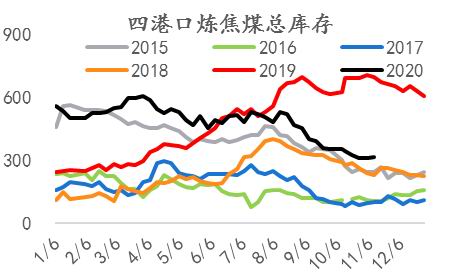 对于焦炭的原料,焦煤总体上供应是充裕的。钢厂库存以及可用天数虽然有所下降,但绝对水平不低。港口的焦煤库存也是如此,虽然低于去年同期,但相较其余年份都要高。
