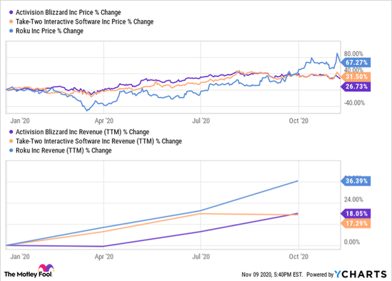 要理解今天的行动,我们必须回顾2020年。投资者一直在推高动视暴雪、Take-Two和Roku的股价,理由是人们将花更多时间玩视频游戏和看流媒体节目,这应该对它们的业务有好处。问题是,尽管Roku的表现更好,但它并没有给动视暴雪或Take-Two带来特别令人印象深刻的增长。