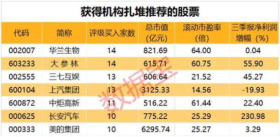除了吸引机构目光的调研股之外,还有多只股被机构贴上“好股标签”。数据宝统计显示,11月以来的7个交易日里,机构共对238只股票给予买入型评级,包括买入、强烈推荐、推荐、增持等。分行业来看,11月以来获得机构买入型评级的股票大都集中在电子、化工、汽车、轻工制造等行业。华兰生物、大参林、三七互娱、上汽集团、中炬高新、美的集团和长安汽车这7只股票均获超10家机构给出买入型评级。