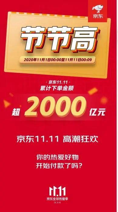11月1日0时起至11日0时9分,京东11.11全球热爱季累计下单金额突破2000亿元。而在去年,京东用户完成2044亿元的累计下单金额则用了整整11天的时间。